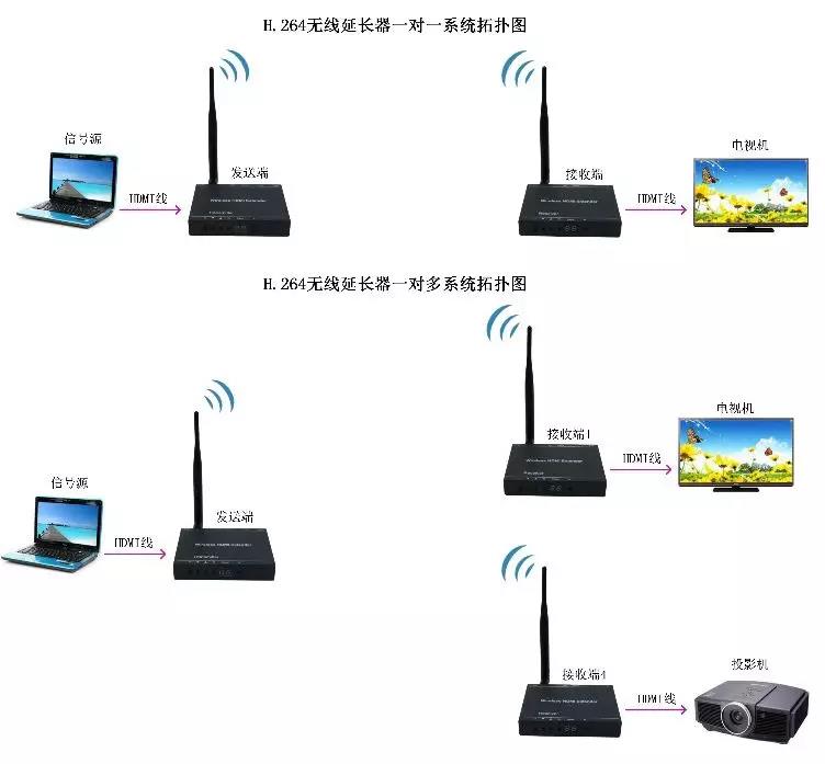 HDMI無線延長器是基于H.264壓縮技術,把10G的高清HDMI信號壓縮到20M帶寬以內,通過延長器發送端內置的雙頻(2.4G和5G)WIFI發送出去,配合WIFI接收功能的延長器接收端,可實現1對1、1對多的HDMI高清信號無線延長和廣播功能。特別適用于不方便布線的會議室、展覽室、教室、展覽等場所。